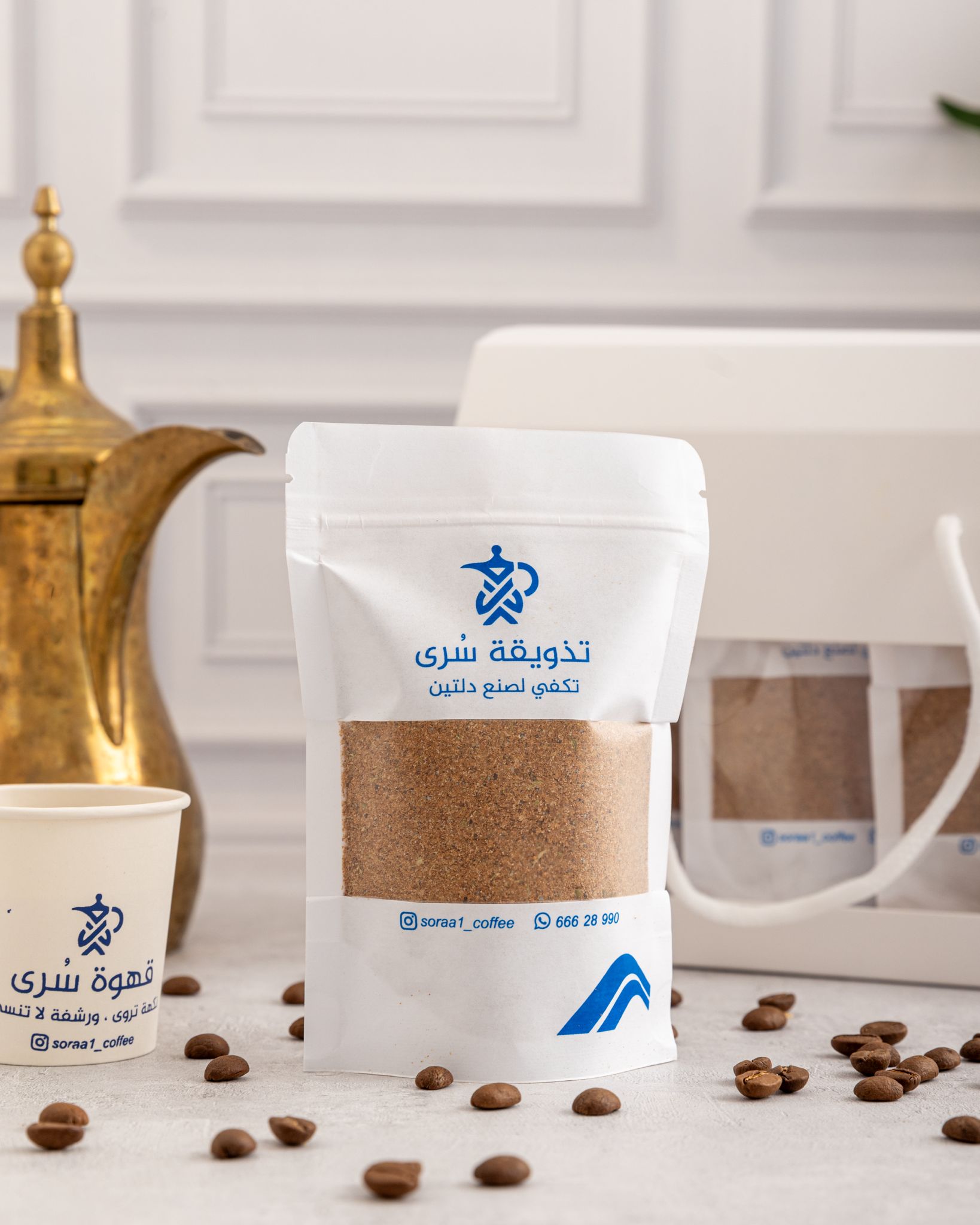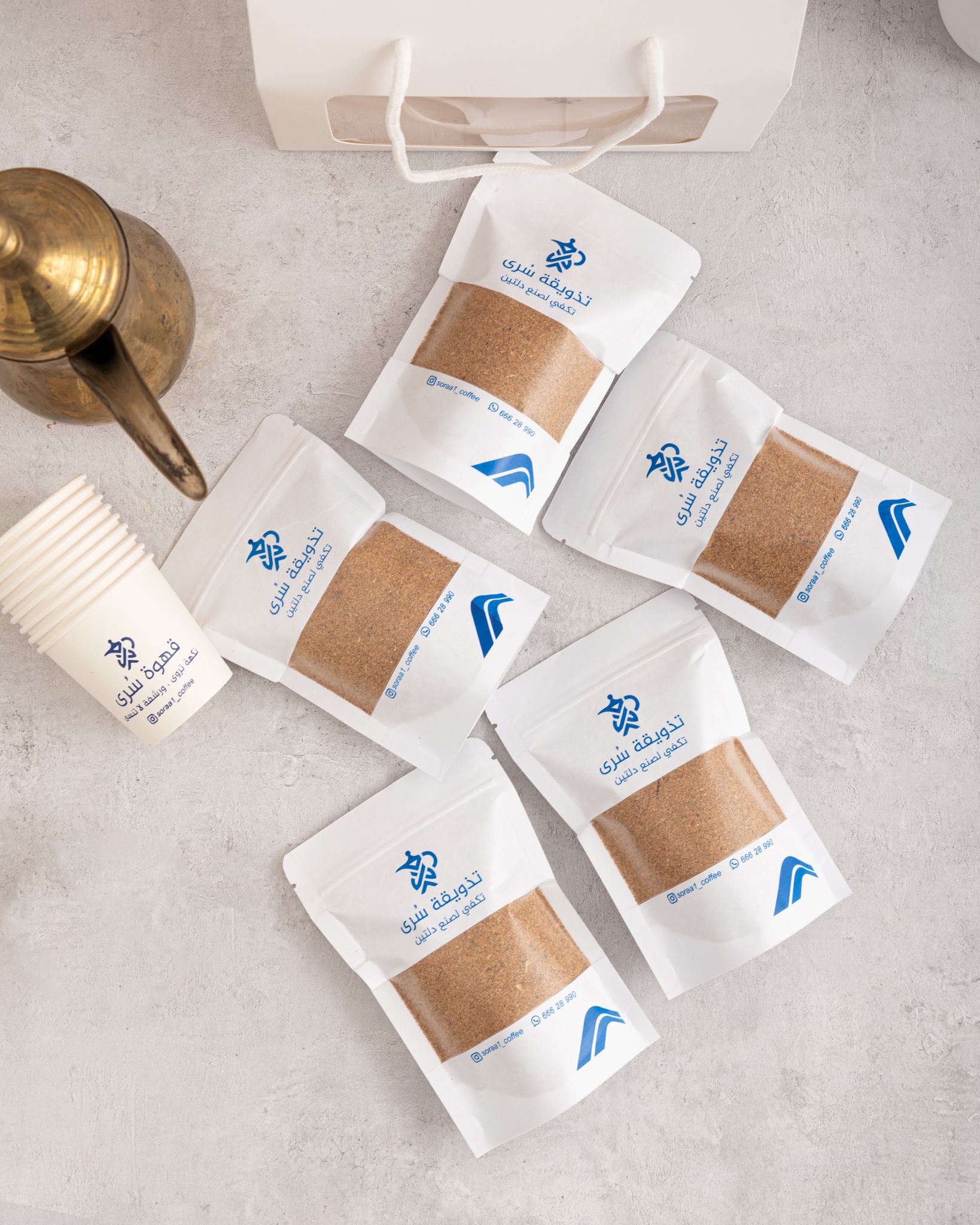 هي عبارة عن أكياس قهوة صغيرة تقدّر بخمس اكياس في سلة واحدة، وكل تذويقة تكفي لصنع لدلتين من القهوة العربية الفاخرة، وجعلنها بشكل أصغر لتكون رفيقتك في ( الدوام- السفر- الطلعات- الكشتات).